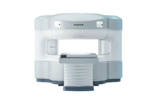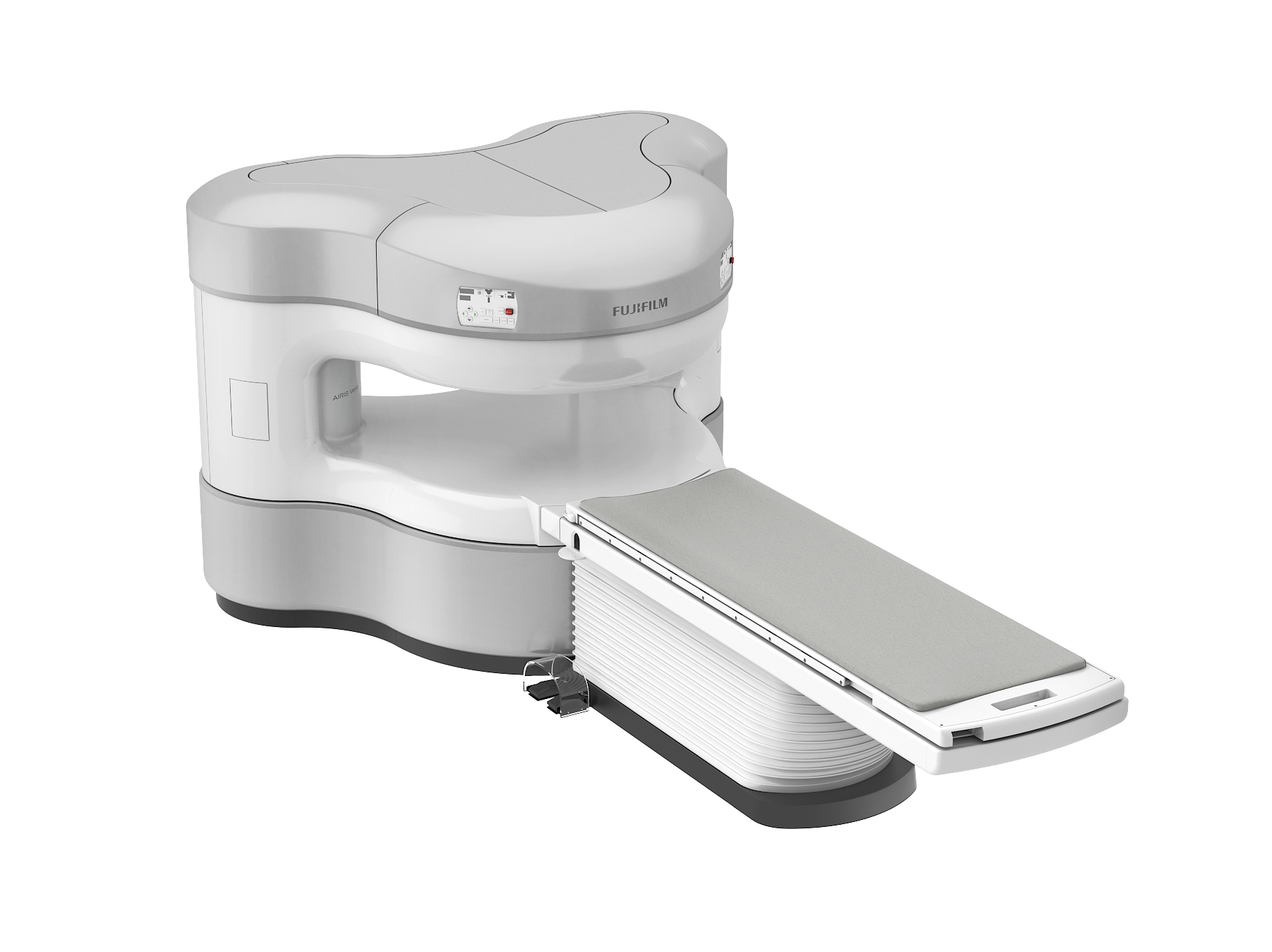 - Escáner de resonancia magnética permanente de 0,3 T con campo vertical y diseño abierto de dos pilares: con una apertura de 210° en la parte delantera y 70° en la trasera.